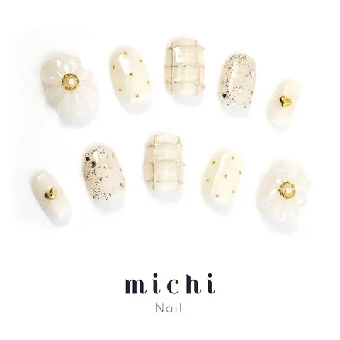 ミチネイルで大人気のぷっくりフラワーシリーズの新作です。乳白色のカラーにちゅるんとした立体お花がキュートなデザインです。ホワイトとゴールドの組み合わせは涼しげで高級感もありこの季節にピッタリのネイルチップです。