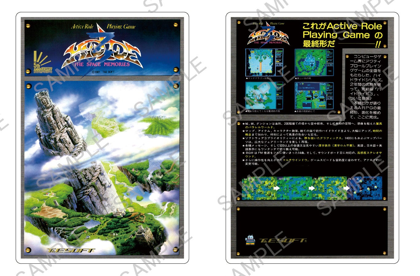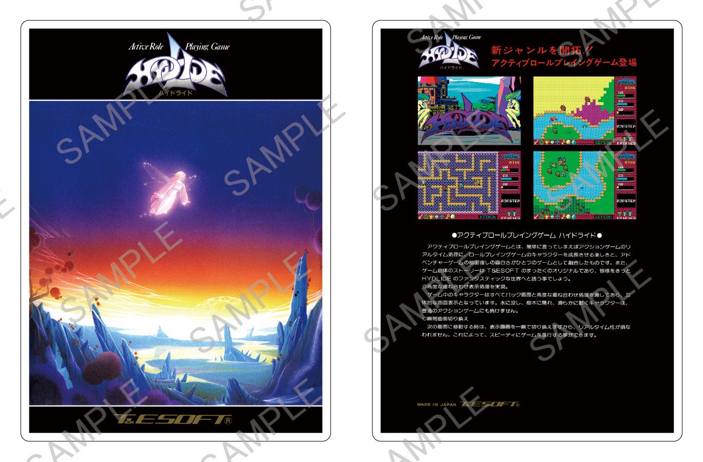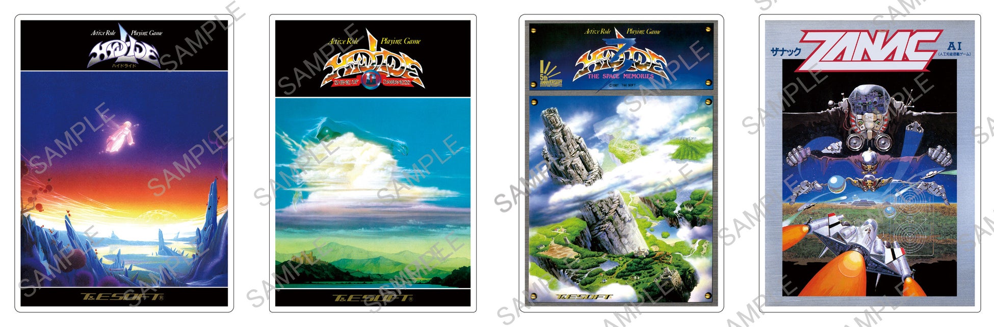 貴重な1980年代のPCゲームパッケージが、アクリルスタンドになって蘇ります。PCゲーム黎明期に人気を博したT&E SOFTのアクション(アクティブ)RPG作品から、『ハイドライド』シリーズ3作(『ハイドライド』、『ハイドライドII』、『ハイドライド3』)と、MSX2の名作シューティングゲーム『ザナックEX』の、計4種類をラインナップ。各アクリルスタンドは両面印刷を採用しており、表面では幻想的なイラストを、裏面では当時の商品説明をお楽しみいただけます。