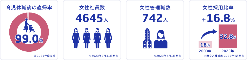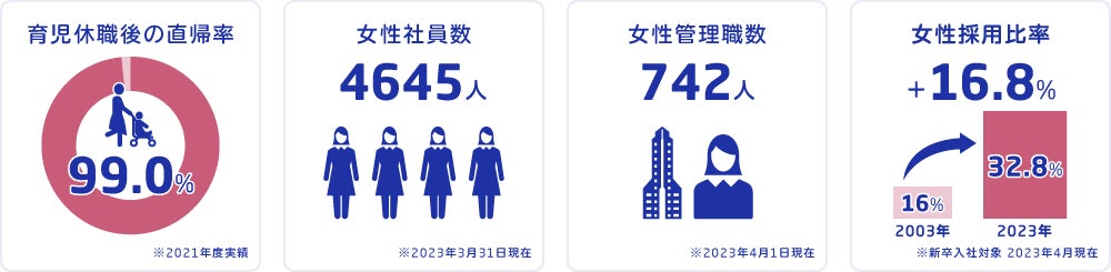 2025中期経営計画でも社員に占める女性比率・管理職に占める女性比率・役員に占める女性/外国人比率の目標値を定め、より多くの女性社員が活躍する姿を目指しています。