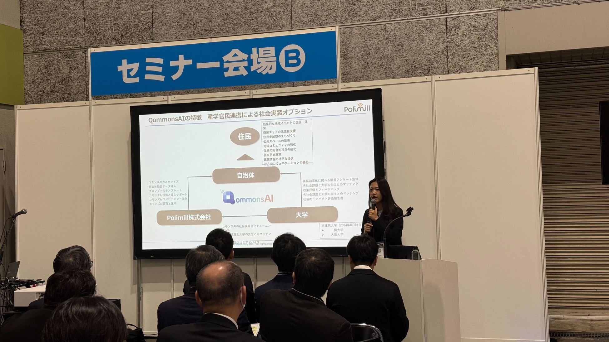 AIの社会実装を進めるソーシャルスタートアップ、Polimill株式会社(ポリミル、本社:東京都港区、代表取締役:横田えり、以下Polimill社)は、自治体のDX推進を支援するAIツール「Qommons AI」を出展中です。11/7に開催された元町長と現役大学生の対談セミナーは大盛況のうちに終了しましたが、11/8本日まで無料体験会を実施中!自治体の業務効率化を支援するデジタルツールの可能性をぜひブースで体感ください!