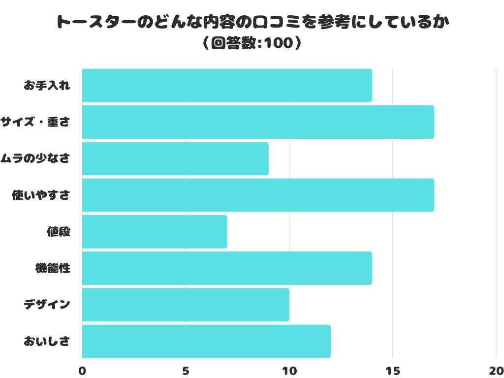 トースターのどんな内容の口コミを参考にするかをアンケートにて調査したところ、1位は「サイズ・重さ」でした。