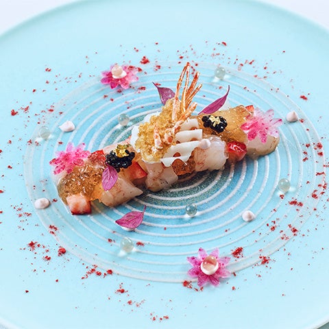 日本海に面する福井県は、豊かな自然環境に恵まれ、四季折々の海の幸・山の幸を味わうことができます。濃厚な甘みが人気の「福井県産甘えび」にロゼスパークリングのジュレを添え、見た目も華やかに仕上げるフランス料理の前菜や、福井県産ブランド牛「三ツ星若狭牛」を料理人の技で最高の状態に焼き上げる鉄板焼、冬の味覚の王様「越前がに」を堪能する会席料理など、バラエティ豊かなメニューを揃えます。