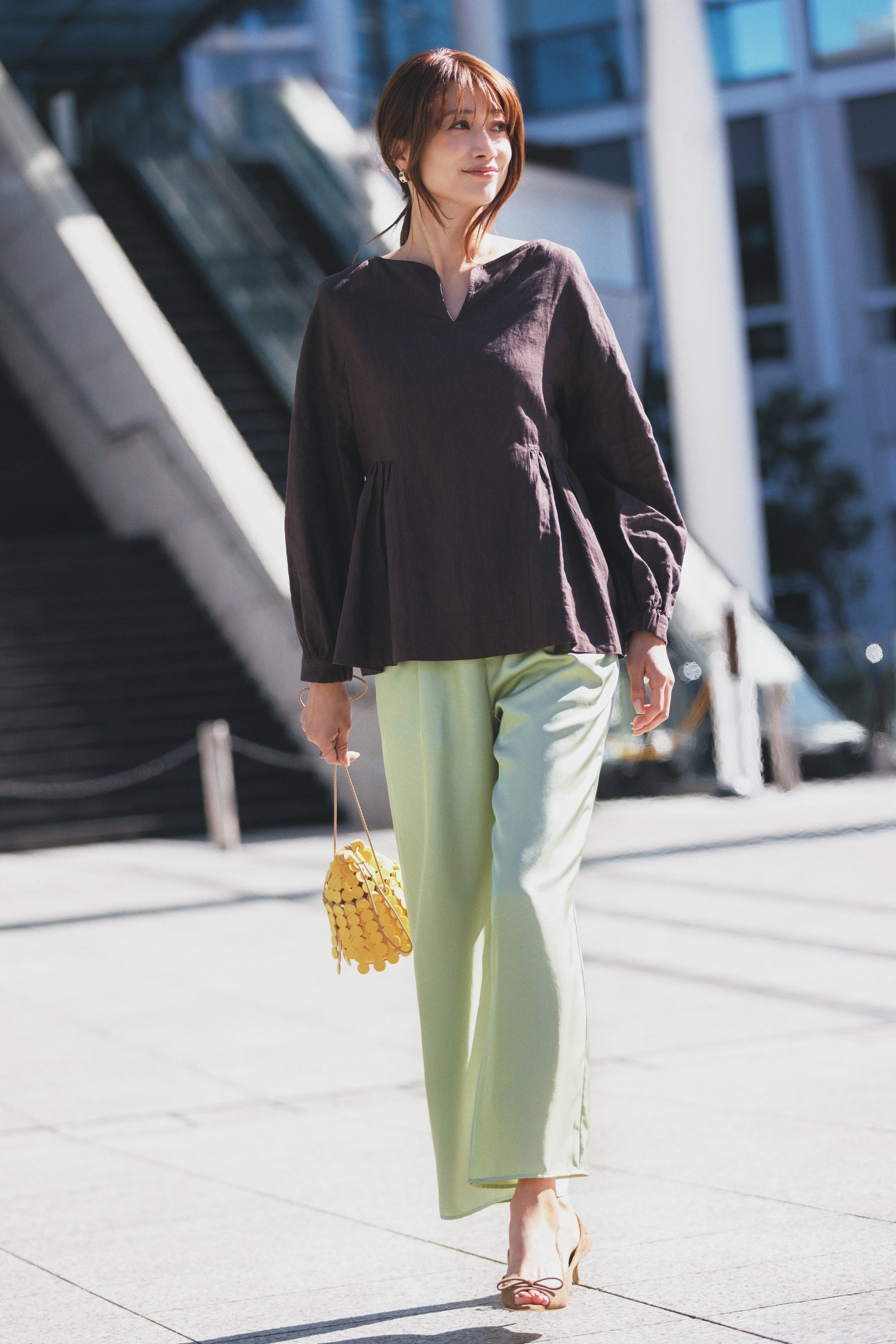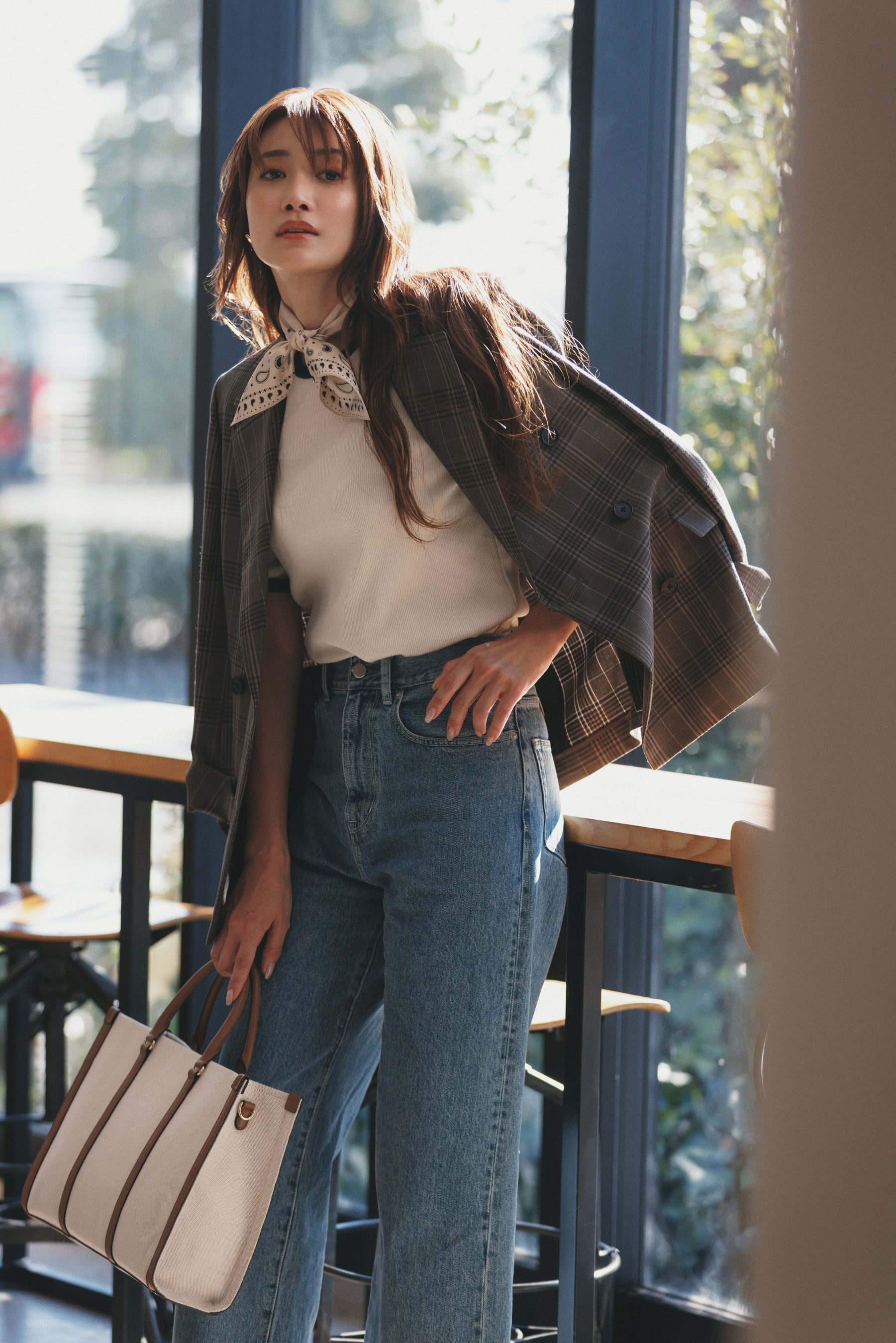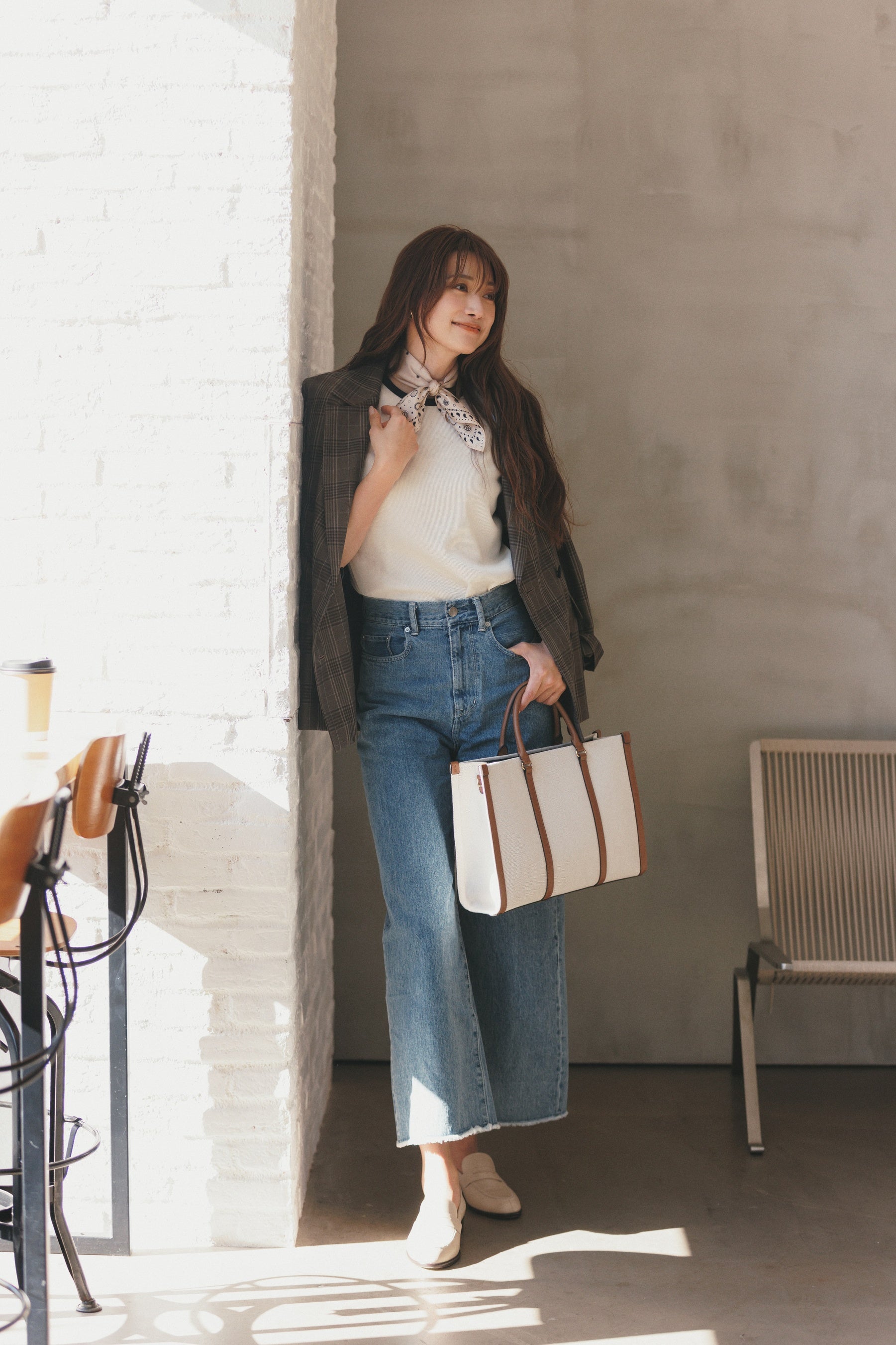 キャンバスのトートバッグはかっちりとしたスクエア型。異素材コンビでラフさもありつつきれいめな仕上がり。ブラウンの配色が堅くなりすぎず、程よく知的な雰囲気。スカーフやメガネでアクセントを加えても。