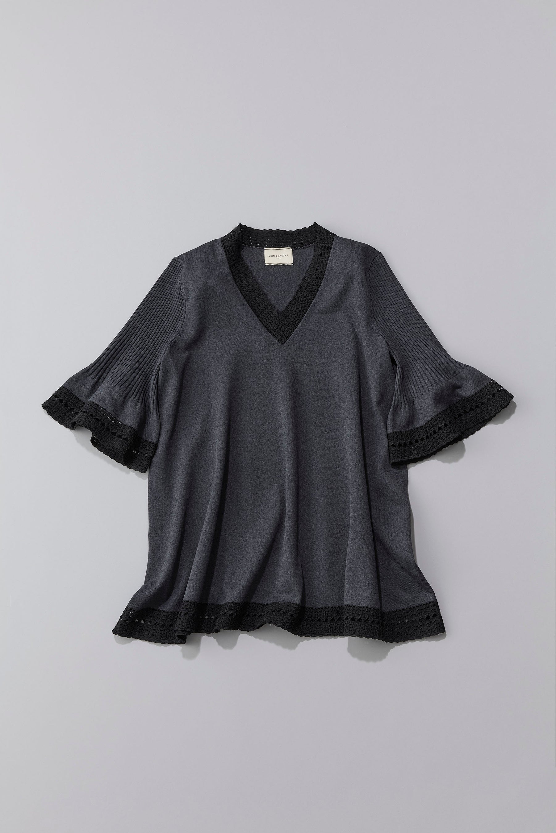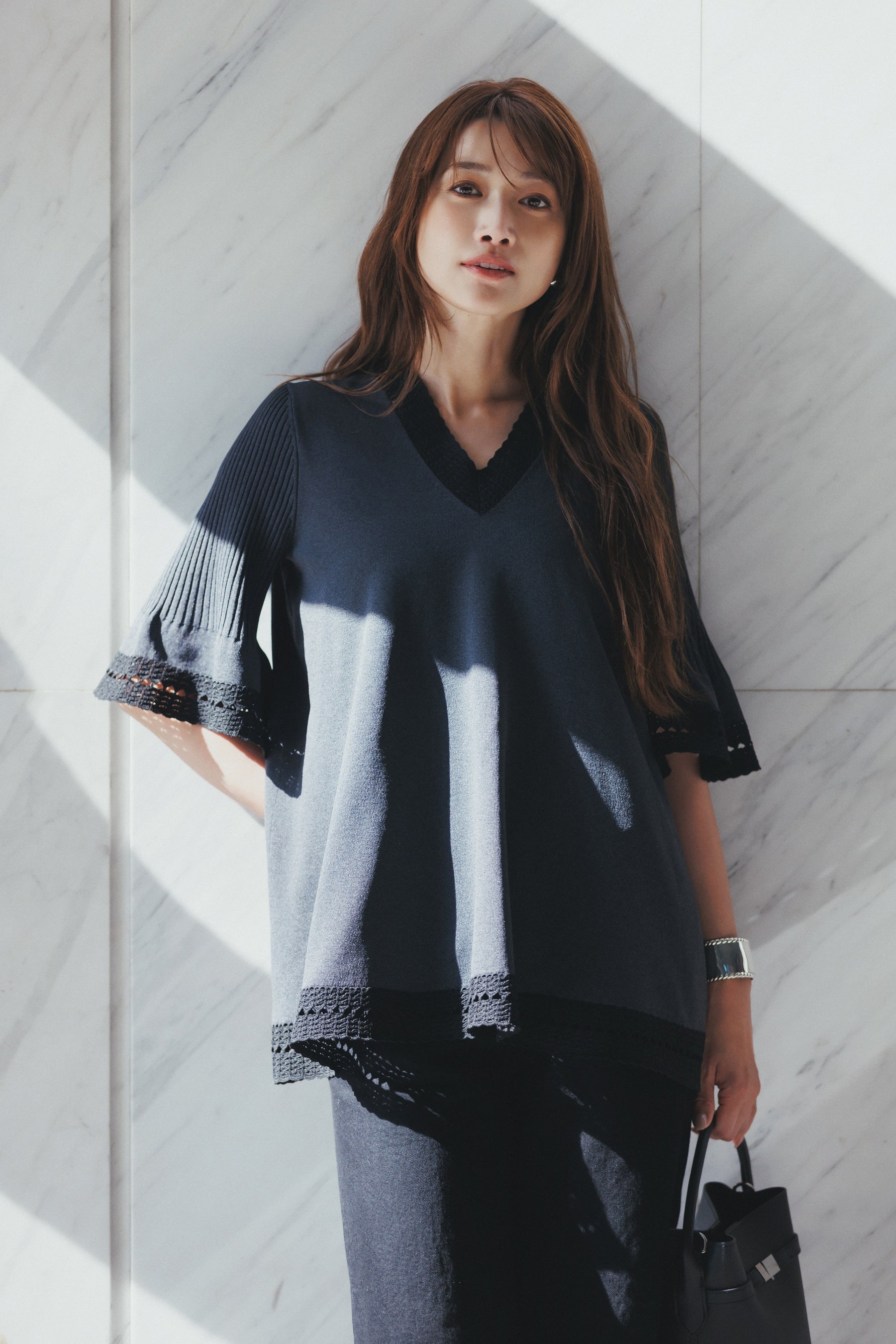 袖口や裾、首元にあしらった鈎針風の編地が美しいニットチュニック。程よく開いたVネックがデコルテを美しく、すっきりと見せてくれます。リサイクルポリエステル素材を使用し、軽さとスポンディッシュなタッチが特徴です。