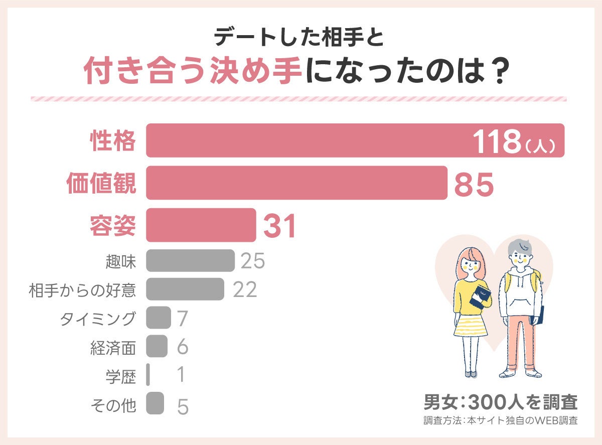 男女300名に対して「デートした相手と付き合う決め手になったのは?」と聞いたところ下記の結果となりました。