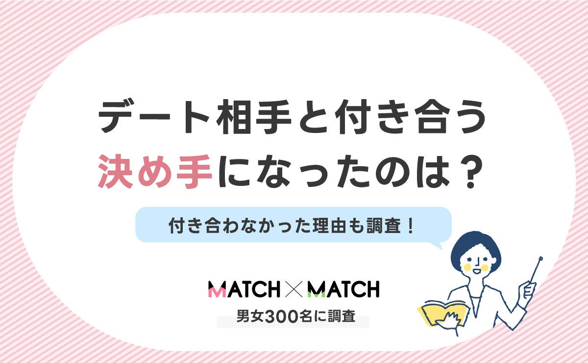 企業と顧客をつなぐDXクラウドサービスを展開する株式会社ショーケース(東京都港区、代表取締役社長:平野井順一、証券コード:3909、以下ショーケース)が運営する、マッチングアプリをわかりやすくガイドするWebメディア「MATCH×MATCH」は、「デート相手と付き合う決め手になったのは?付き合わなかった理由も調査!【男女300名】」の調査結果をまとめました。