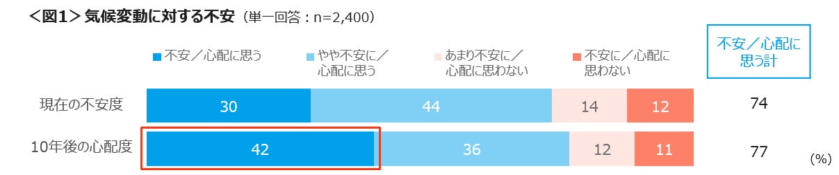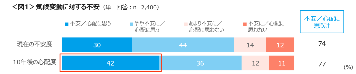 現在の気候変動に対し「不安に思う」は30%、「やや不安に思う」44%と合わせて74%は”不安感”をいだいている。今より10年先の気候変動への心配は、「心配に思う」は42%であり、現在の「不安に思う」割合より12pt高い。<図1>