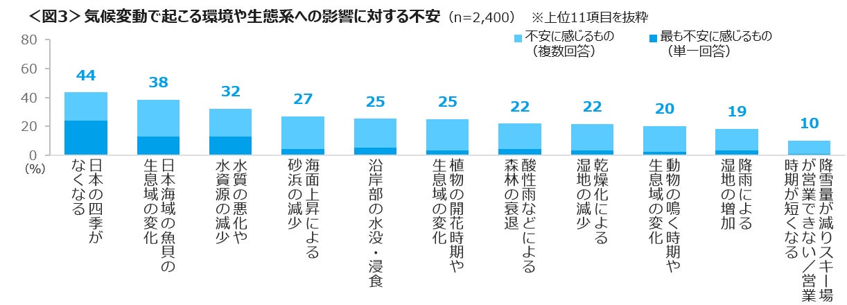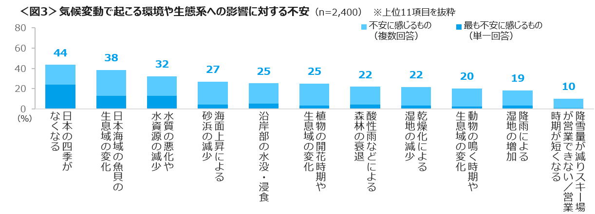 環境や生態系への影響に対する不安では、記録を更新する猛暑日が続いたこともあり「日本の四季がなくなる」は44%と高く、次いで「日本海域の魚貝の生息域の変化」「水質の悪化や水資源の減少」が3割台であった。気候変動による生態系への影響よりも、自分の身にもいつか起きうる自然災害への影響の方が全般的に不安感が高い結果となった。<図3>