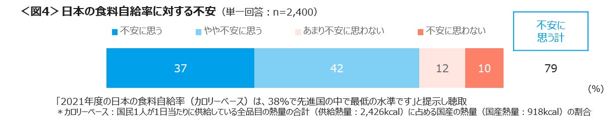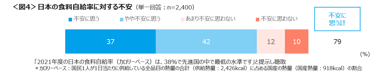 日本の食料自給率について“2021年度の日本の食料自給率(カロリーベース)は、38%で先進国の中で最低の水準”を提示した上で不安度を聴取した。「不安に思う」は37%、「やや不安に思う」は42%、合わせて8割近くが日本の食料自給率に不安をもつ結果となった。<図4>