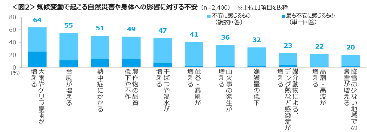 気候変動で起こる、自然災害や身体への影響に対する不安では、「大雨やゲリラ豪雨が増える」が64%と最も多く、「台風が増える」「熱中症にかかる」「農作物の品質低下や不作」「干ばつや渇水が増える」「竜巻・暴風が増える」が4割台と続く。この夏、日本各地で起きた自然災害に関する項目が上位となった。<図2>
