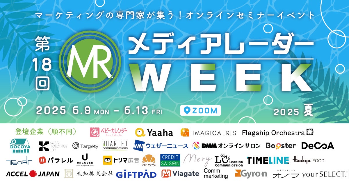 株式会社アイズ(所在地:東京都渋谷区、代表取締役社長:福島範幸、東証グロース:5242)が運営するNo.1*の広告業界のプラットフォーム「メディアレーダー」は、2025年6月9日(月)~13日(金)の5日間で、マーケティングセミナーイベント「第18回メディアレーダーWEEK 2025 夏」を開催します。
