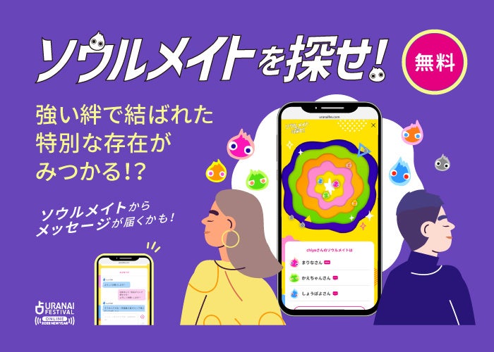 プロフィールを登録してエントリーすると、あなたのソウルメイトを探し出します。ソウルメイトのプロフィールを読んだりメッセージの交換も可能です。監修はTBS番組「占いメガネ(https://www.tbs.co.jp/uranaimegane/)」にも出演中の人気占い師「暮れの酉(くれのとり)」「叶ここ(かのうここ)」「法演(ほうえん)」「斗弥(とうわ)」。