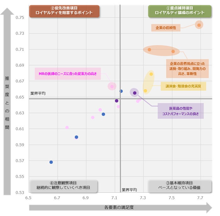 また、「製薬企業主催の講演会、勉強会の充実度」、「製薬企業によるWeb講演会の充実度」といった講演会に関する項目や、「医薬品の性能やコストパフォーマンスの良さ」もロイヤルティ向上につながる結果となりました。