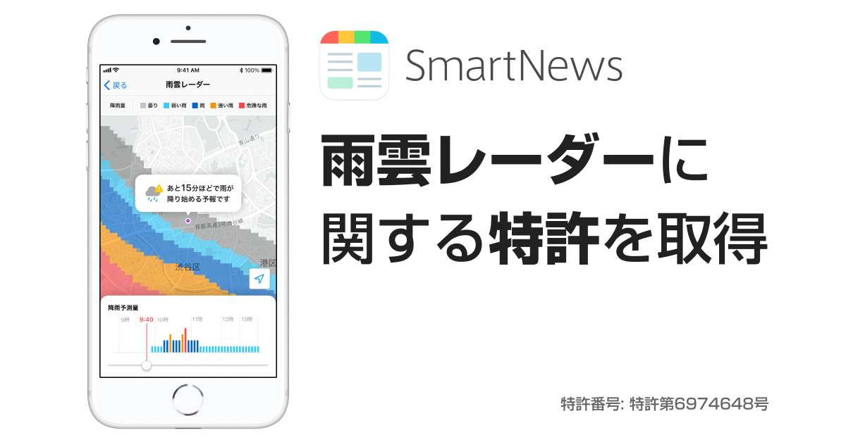 スマートニュース株式会社(東京都渋谷区、代表取締役:鈴木健)は、ニュースアプリ「SmartNews」で提供している、地図上の任意の地点でリアルタイムに降雨を予測する「雨雲レーダー」に関する発明で、この度、特許を取得しました。