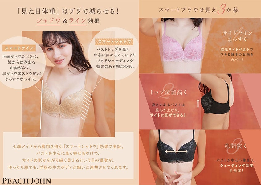 株式会社ピーチ・ジョン(本社:東京都港区 / 代表取締役社長:杤尾学)は、シリーズ累計79万枚※を突破した、着用するだけで「見た目体重」をオフする大ヒットシリーズ「スマートブラ」の新デザイン「スマートブラレースエッセンス」を本日5月6日(金)に発売しました。これから到来する薄着の季節に重宝し、着用するだけで細見えするブラは必見です。