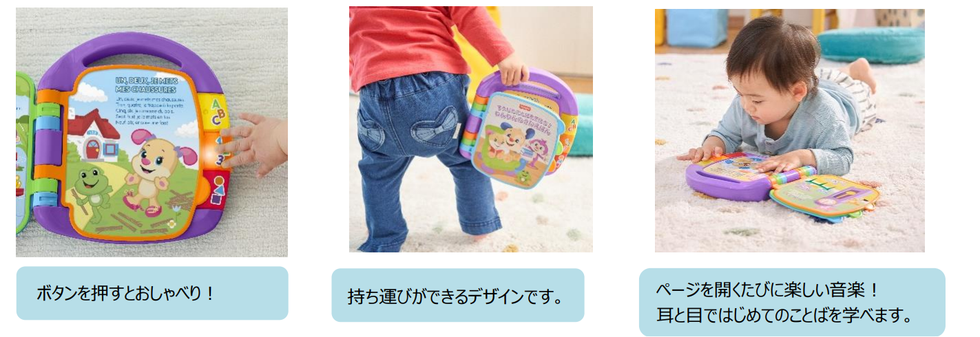 | 【Point】 ✓ 90 年以上の歴史をもつベビー・プリスクール向け玩具グローバル売上 No.1*ブランド「フィッシャープライス」。 * The NPD Group/2021/USD ✓ 「うたっておしゃべり!バイリンガル・わんわん」は、100 の言葉、 75 以上の歌やサウンドを収録しお子さまの 英語デビューを応援!して くれるぬいぐるみの知育玩具です。 ✓ 「指あそびとおしゃべりわんわんのバイリンガル・パソコン」は、 キーボードをたたくと、1から 10 までの数字やあいさつが日本語と英語で 流れる!画面にお顔もうつり、ママ・パパのまねっこをしてリモート会議ごっこもできる! ✓ 「すうじとことばを学ぼう!わんわんのうたえほん」はページをめくるたび、 ことば、色、数字を6つのうたが流れ楽 しみながらはじめての学びを遊びながらサポートします。 |