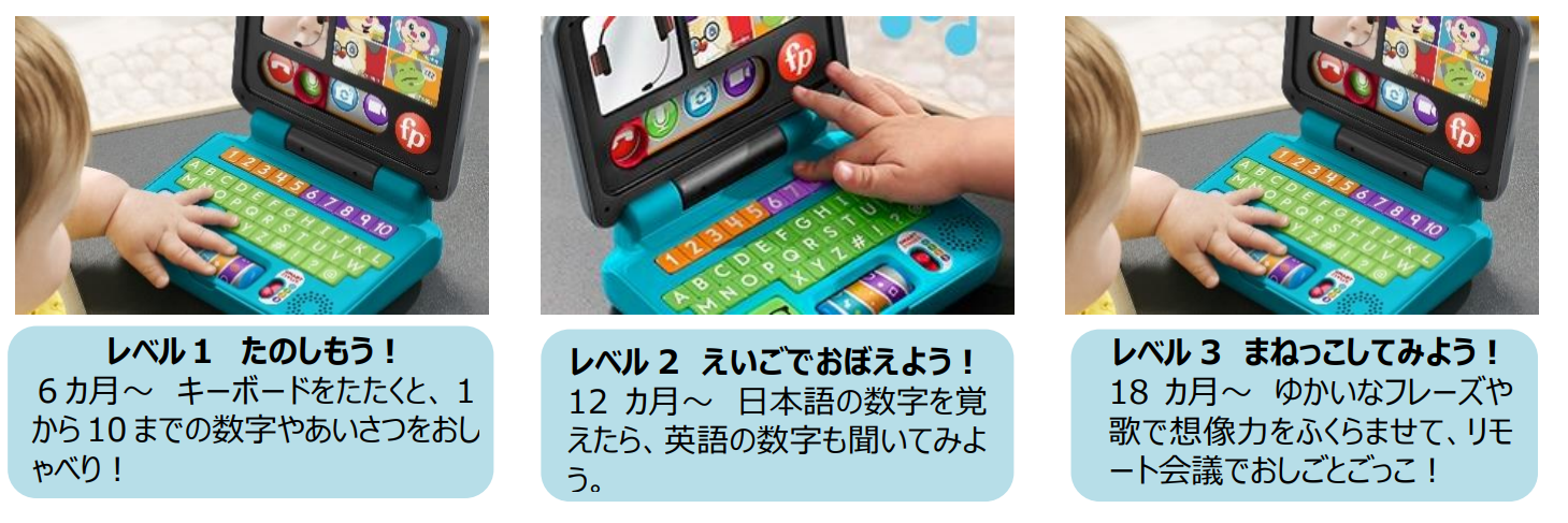 ママやパパのまねっこして、リモート会議でおしごとごっこを楽しめる、赤ちゃん専用パソコ ンです。画面にお顔が映ってミーティングに参加ごっこができます。キーボードをたたいて 英語であいさつしたりみんなと歌って楽しめます。 3 段階にレベルを切り替えられるスマートステージ機能を搭載しているので、成長段 階にあわせて長く遊ぶことができるおもちゃです。
