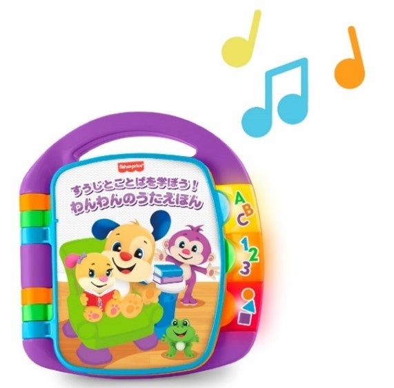 ことば、色、数字を6つのうたで学べる絵本です。ページをめくると歌と楽しい発見で 夢中になれちゃう。わんわんと一緒に学んで、歌おう! ABC ボタン 絵の中にある ABC から始まる言葉を英語でおしゃべりします。 すうじのボタン 絵本に登場するものの数をおしゃべりします。 形と色のボタン 絵本に登場するものの形や色の名前をおしゃべりします。 はじめてのことば ページを開くたびに楽しい音楽!耳と目ではじめてのことばを学べ ます。