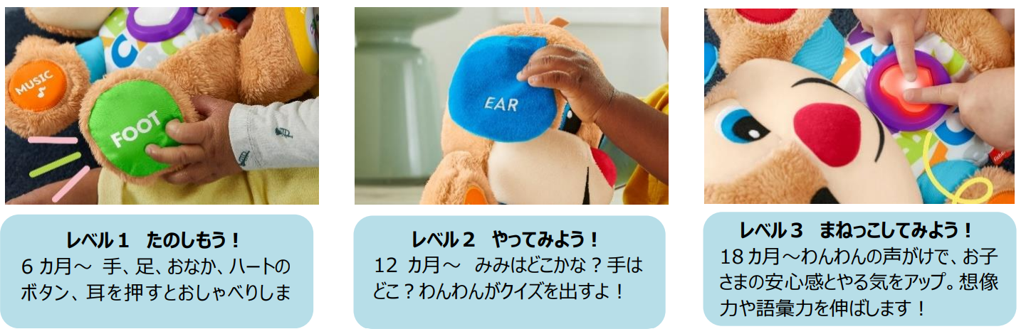 歌やおしゃべりが大好きなわんわんと遊びながら楽しく学べます。やわらかくて抱きしめ たくなるわんわんは、いつもいっしょに連れていきたいお子さまのおともだちにぴったりで す。100 の言葉、75 以上の歌やサウンドを収録した充実の知育コンテンツもはいって おり、はじめての英語デビューを応援してくれます。 3 段階にレベルを切り替えられるスマートステージ機能を搭載しているので、成長段 階にあわせて長く遊ぶことができるおもちゃです。