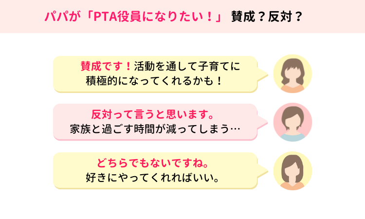 一方で、賛成の理由は「仕事ができる人だから適任」「役員をきっかけに子育てに積極的になれると思う」「パパの活躍ぶりは子どもにもいい影響を与える」など。パパの参加によって生じる効果に期待を寄せる声が届いています。