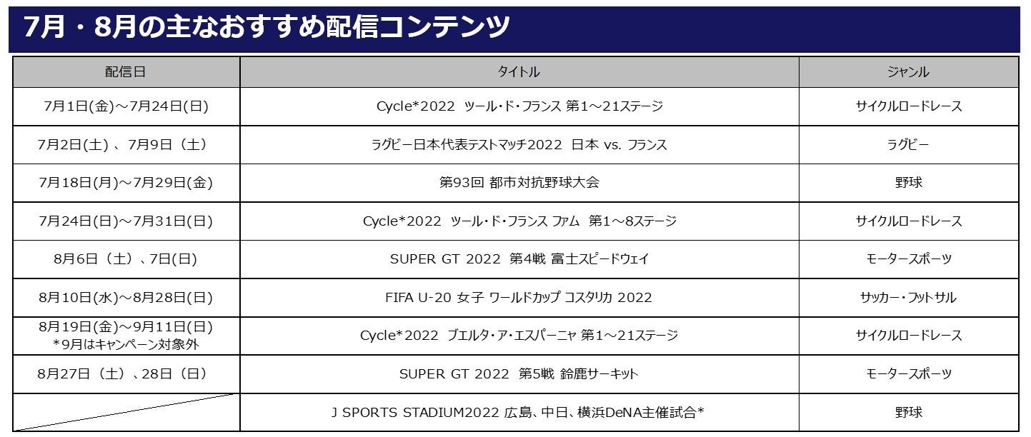 今年の夏の総合パック 1か月お試しキャンペーン期間には「Cycle*2022 ツール・ド・フランス」、「ラグビー日本代表テストマッチ2022 日本 vs. フランス」、「SUPER GT 2022」、「都市対抗野球大会」など、各ジャンルのJ SPORTSのおすすめコンテンツが盛りだくさん。この機会にこれまで観戦経験の少ないスポーツジャンルをご覧になってみてはいかがでしょうか?