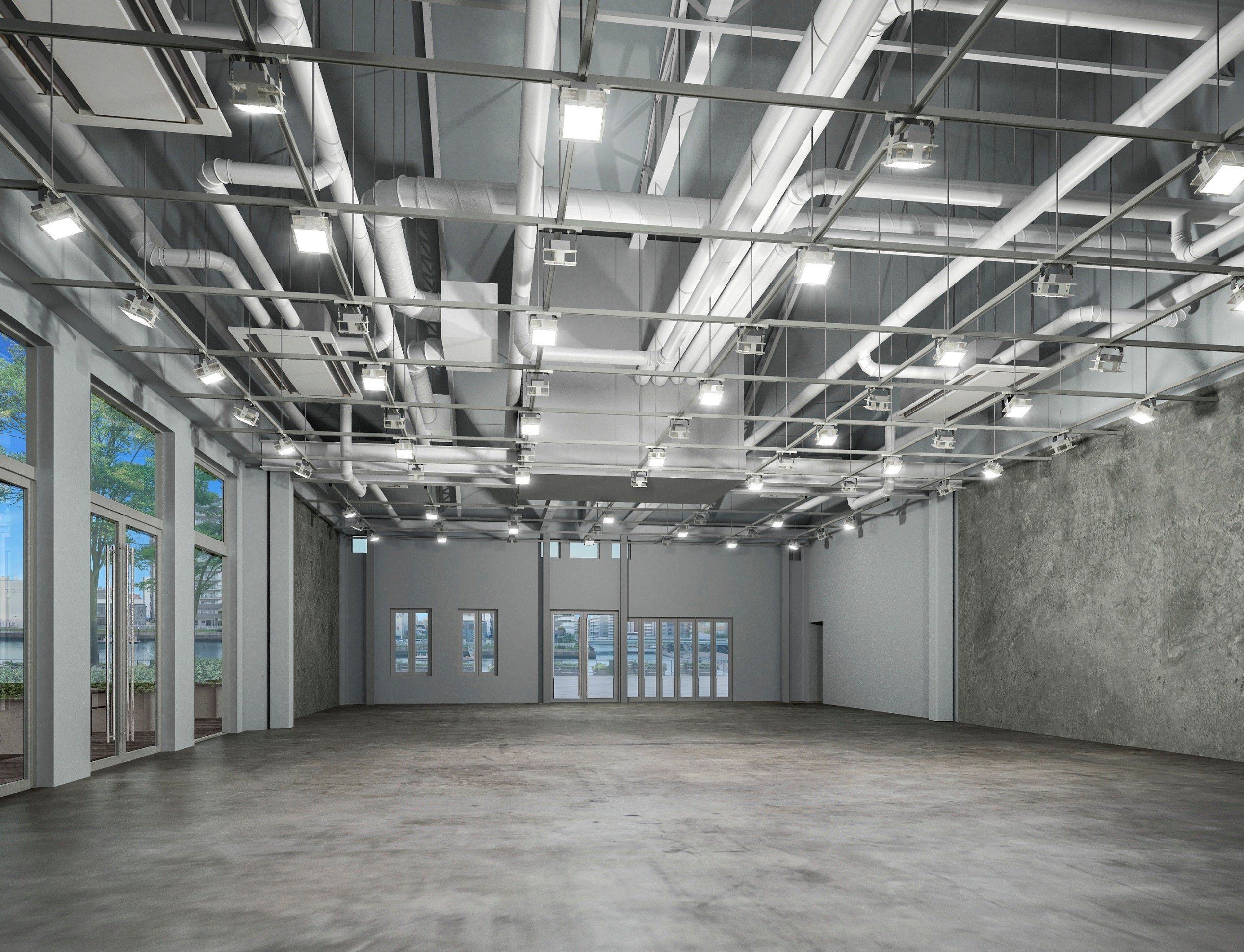 倉庫建築ならではの無柱構造を生かしたワンフロア空間です。約4.55mの天井高があり、柱に制限されることなく、展示物やステージ、演出装置の配置が可能です。用途に応じて、自在にレイアウトを組み替えることができます。天井には照明や音響、装飾を設置できる吊元(つりもと)を備えています。来場者用の専用トイレや控室を設けており、展示会や発表会などのイベントにも最適です。