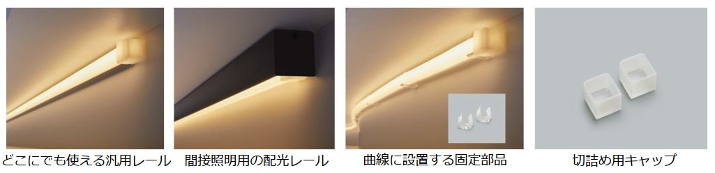 シリコーン製で柔らかく直線や曲線(最長6m)による新たな照明演出ができる汎用性が高いドットレスのライン照明です。様々な場所へ簡単に美しく施工できるように、3つの取付方法(汎用レール、配光レール、曲線部品)を用意し、現場での長さ調節(切詰め)もできるようになります。