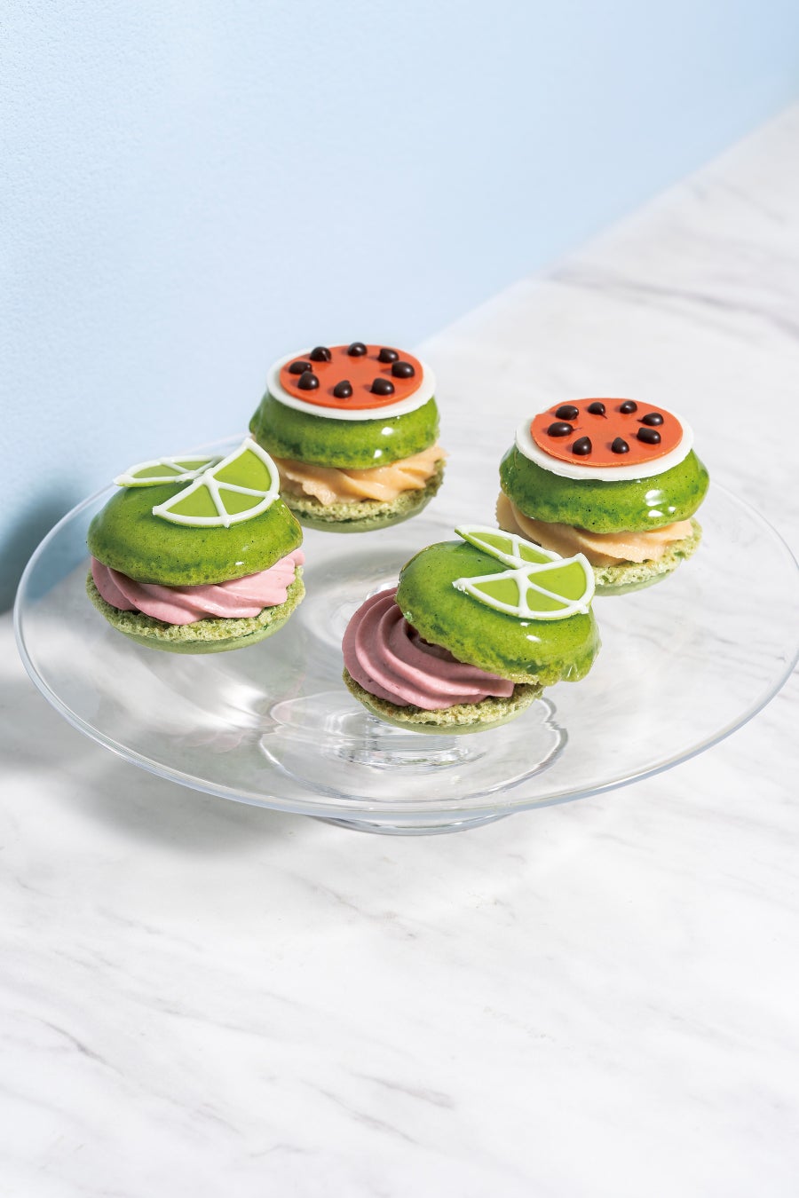 ライムのデコレーションが印象的なマカロンには、ライムとフランボワーズピューレにホワイトチョコレートを合わせたガナッシュを挟み、スイカの断面をイメージしたデコレーションをのせたマカロンには、スイカピューレとホワイトチョコレートで仕上げたスイカのガナッシュを合わせました。アトリエ ドゥ ゴディバならではのユニークな夏のマカロンです。