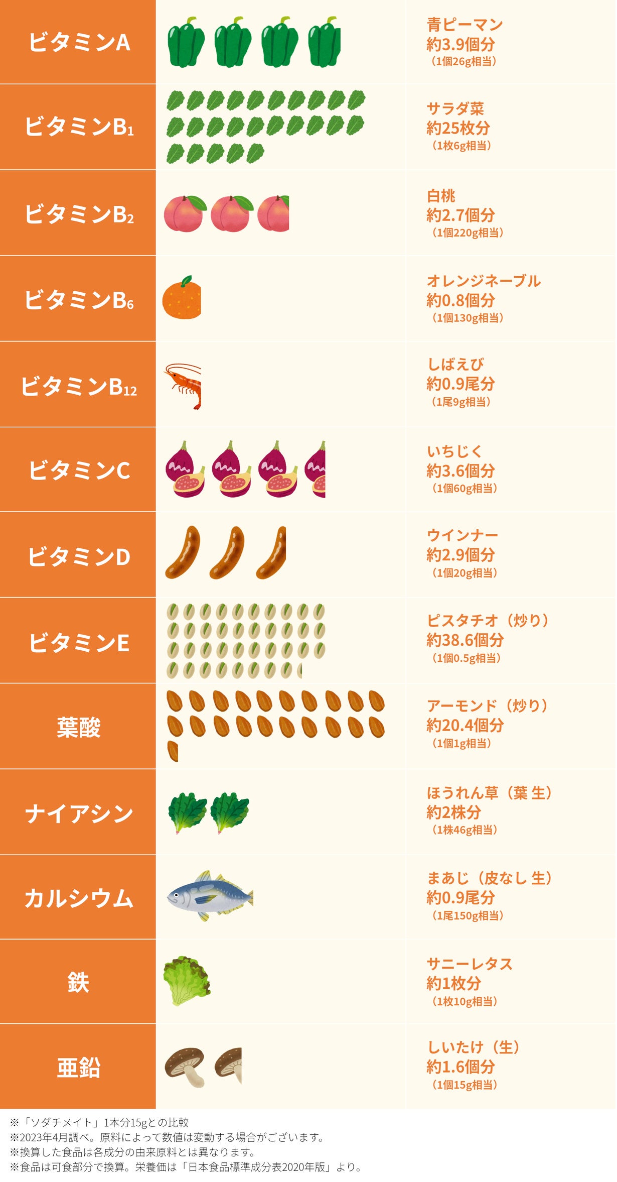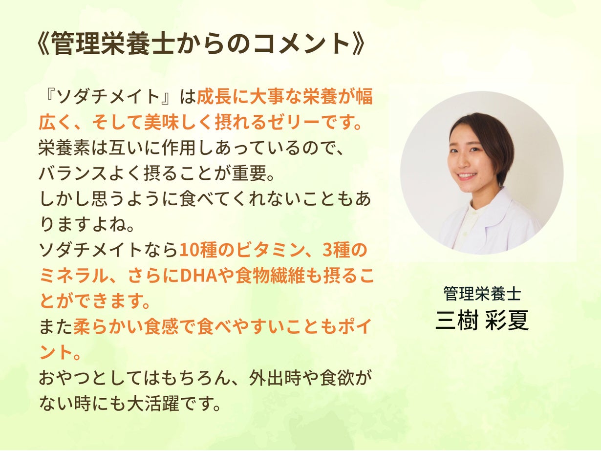 この結果により、お子様の成長のために毎日栄養バランスのとれた食事の用意を心がけても、忙しい時はどうしても品数が減ってしまったり、お子様の好き嫌いによりバランスよく食べてくれないといった様々な理由により、実際には難しいという潜在的なお悩みがあるのではないかと考え、10種類のビタミンと3種類のミネラルが含まれたスティックゼリー「ソダチメイト」を開発いたしました。管理栄養士が監修した商品です。