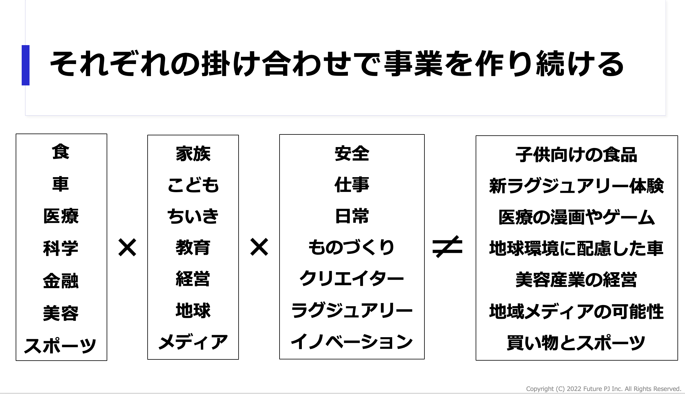 未来PJでは、2023年2月までに30のPJ創出を目指しています。既に医療、科学、スポーツ、車、イノベーション、金融、ちいき、経営、こども、クリエイター、食、地球、美容、日常、メディア、仕事、ものづくり、安全、教育、ラグジュアリー、家族など21のPJを表明しています。