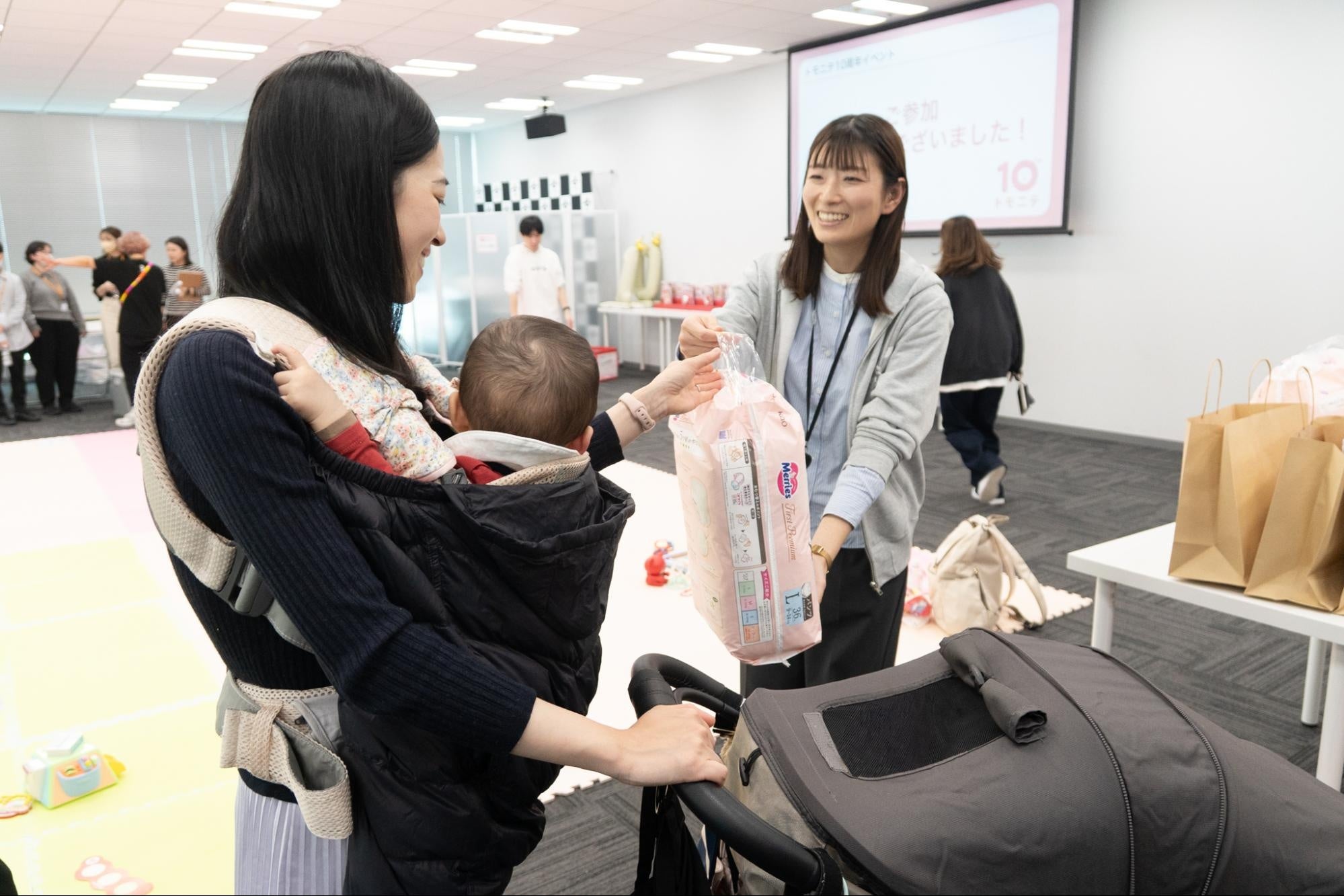 イベント終了後には、ご参加いただいた皆さまへお土産をご用意。ピープル様(なめられ太郎)、ロッテ様(オリジナルコアラのマーチ)、牛乳石鹸様(カウブランド ベビーシリーズ)、花王様(メリーズファーストプレミアム1パック)にご提供いただきました。