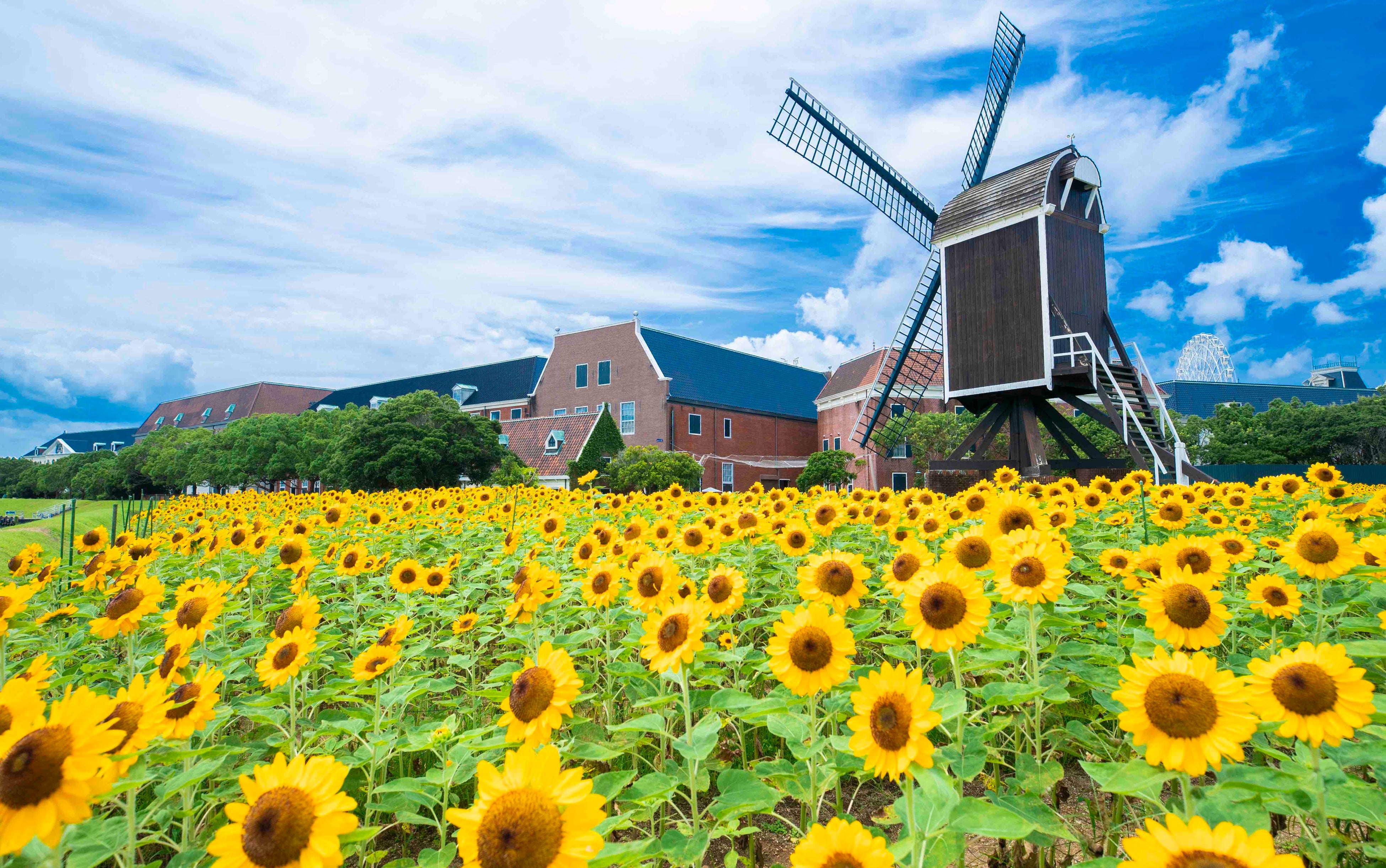 ヨーロッパの街並みでひまわりが咲き誇る光景はハウステンボスならでは。是非ひまわりと一緒にたくさん写真を撮ってみてくださいね☆