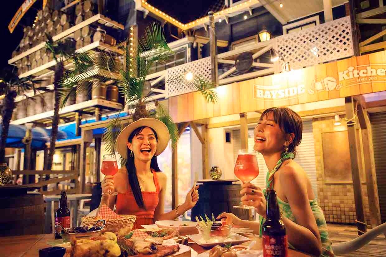 また好評のビール祭がバージョンアップ!九州のクラフトビールやメガジョッキなどさまざまな種類を取り揃えており、ビール好きは必見です♪さらに、ノンアルコールドリンクもカクテルや梅酒、ワインなどラインナップが豊富で、みんなで乾杯できます✩ベイサイドステージでは、南国気分がさらに盛り上がるナイトショーを開催。ショーを見ながら屋外テラスでお酒を飲めば海外のリゾートにいるような気分に!スペアリブやローストビーフなど、
