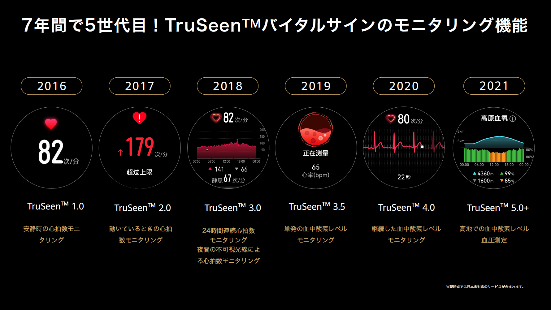 2021年には高地での血中酸素レベル測定への対応を始めました。高度4千メートルの地でも高い精度を維持します。また、多くの方が関心を持つ血圧測定も可能になりました。7年かけて培ったTruSeen(TM)をスポーツ・ヘルスケア事業の重要技術に据え、この土台の上に、製品も、モニタリング機能も、末長く成長を続けてまいります。