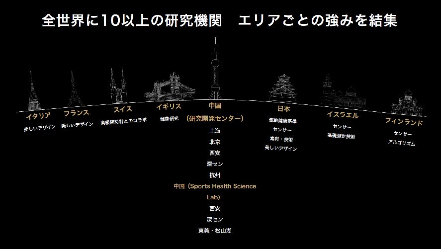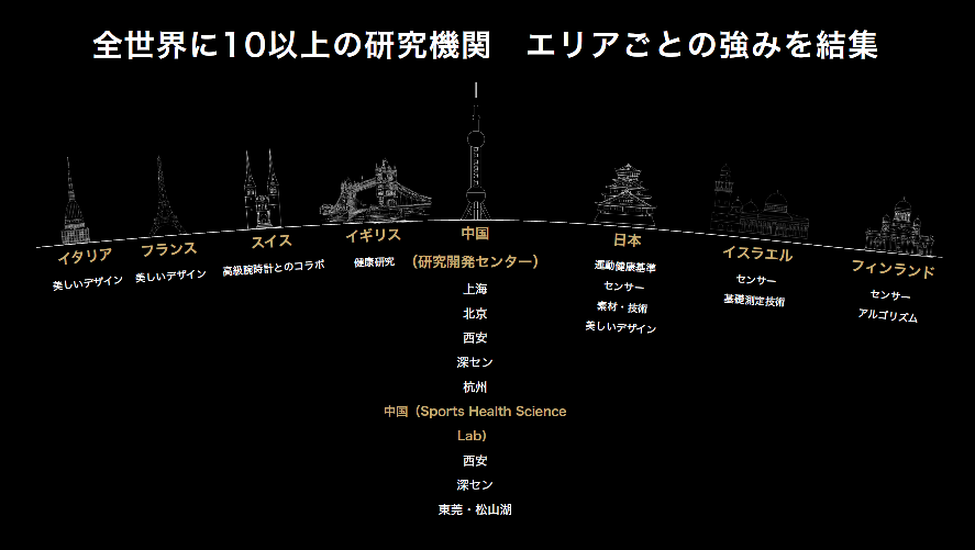 また、心臓、呼吸器、血管などについての研究も行っており、特に力をいれているのが、血糖値、肺機能、高地に関する研究です。この3つは、すでに関連機関と連携し研究や製品設計を行っています。今後はこうした研究プロジェクトに多くのボランティアの参加を募り、より良いサービスに仕上げていきたいと考えています。「産学研医」にサイエンス科学を掛け合わせ、技術を開放し、技術のボーダレスな融合を進めます。すでに80あまりの専門機関と、心臓、血圧、血管、幼児歩行、血糖、心肺、高山病に関する研究を行っています。これからも専門機関と健康技術を組み合わせ、ユーザーの健康を支えたいと存じます。