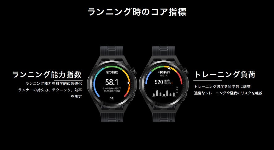 例えば、ランニングです。TruSport(TM)にはランニング能力指数を算出する機能があります。これは総合的な指標で、個人の走力、持久力、ランニング技能などを定量化してくれます。例えば、指数58.1ですと、だいたいマラソンのサブ3レベルに相当します。日々のワークアウトからトレーニング負荷を計測し、無茶なトレーニングに走らないよう、休息アドバイスも行います。これによりオーバートレーニングを防ぐことができます。