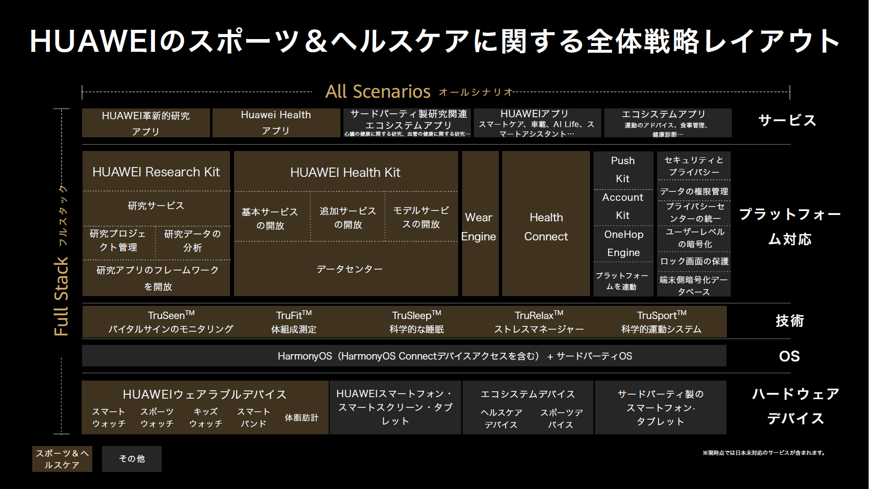 昨年のファーウェイ開発者大会で発表いたしました全体戦略について、改めてご紹介させていただきます。ウェアラブルデバイスやヘルスアプリは弊社が比較的得意とする部分です。しかしユーザー、パートナーから見たとき、それだけでは不十分であると言わざるをえません。ハードウェア、OS、技術、プラットフォーム、アプリケーションからソリューションに至るまでフルスタックで取り組んでいきたい。また、弊社単独ではなく、プラットフォームを開放し、パートナーと共に取り組みたいと考えています。