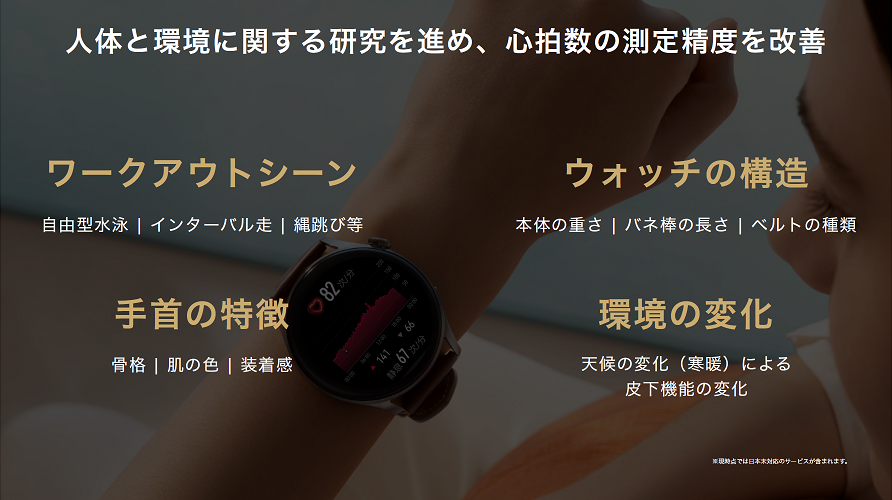 ありがたいことに、ファーウェイスマートフォンといえばカメラ、とのお声を多くのユーザー様から頂戴しています。カメラはある意味で、第二の眼として、世界の美しさを発見する働きをしています。ウェアラブルデバイスにも目があります。それは背面センサーです。このセンサーが見えざる情報を見て、バイタルサインをとらえ、心拍や呼吸を通して今起きていることを読み取ります。さらに未来までも予測します。弊社はセンサー技術やビッグデータの活用、アルゴリズムの研究開発を通じて、見えないものを見られるようにしたい。「鼓動1つから読み解けるもの」を追及しています。