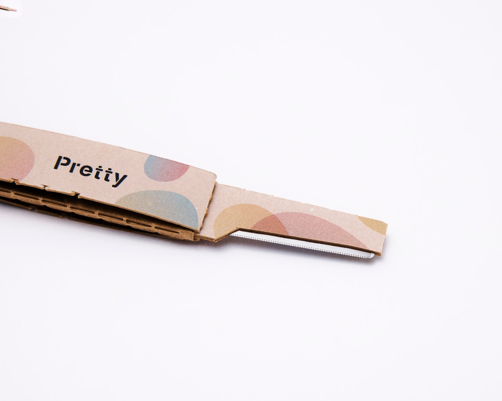 「Pretty 紙カミソリ(R)L型 2本入」は、「紙カミソリ(R)」のコンセプトである脱プラスチックを踏襲し、プラスチック部分を従来製品から90%削減。また、持ち運びやすいよう組み立て式とし、組み立て前の厚さは4mmの薄型設計です。その他、T型の「紙カミソリ(R)」には無かった世界最小ガード※³を刃に取りつけているため、顔周りでのご使用など、より安全に使用したいシーンにもおすすめです。