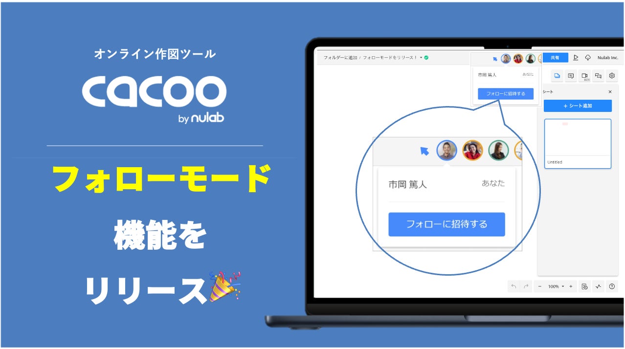 株式会社ヌーラボ(本社:福岡県福岡市、以下 ヌーラボ)が提供しているオンライン作図ツール「Cacoo」は、全プランのユーザーを対象に「フォローモード機能」をリリースしました。この機能により、広いキャンバス内でどの部分を操作しているかをリアルタイムで共有できるため、オンラインで行う会議やワークショップ、プレゼンテーションの効率を高めます。