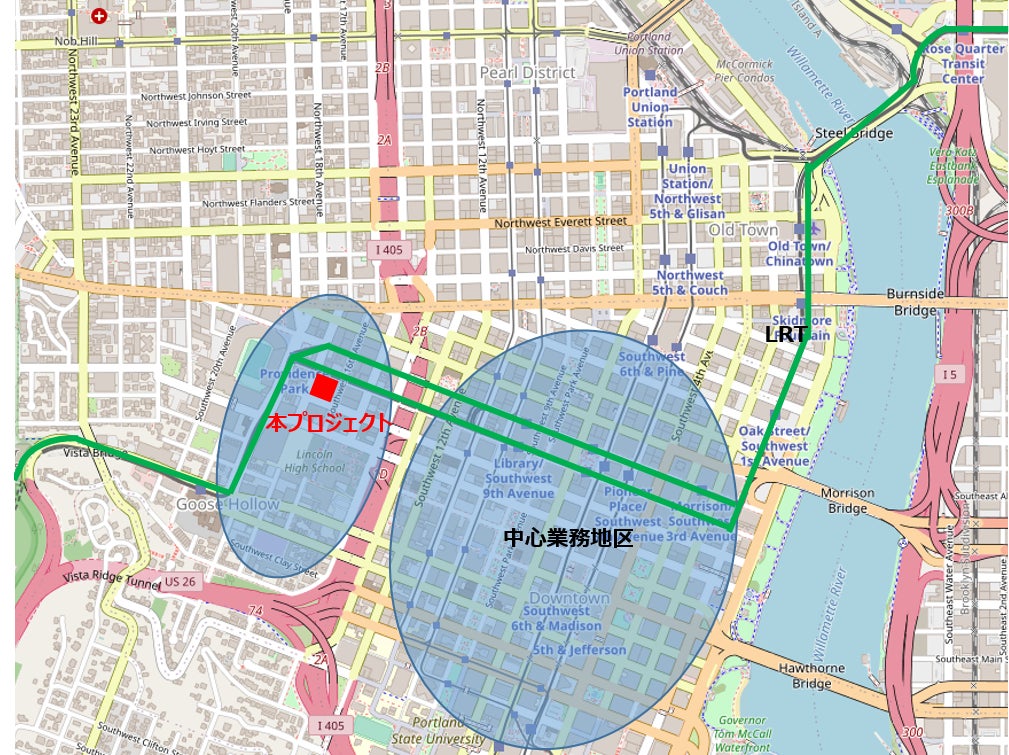 この度、参画する「Press Block プロジェクト」は、ポートランド市の中心業務地区から西に約1km、ライトレール(以下、LRT)の「プロビデンスパーク」駅から徒歩1分の交通利便に優れたエリアに位置する、地上24階/地下5階建て、総戸数341戸の賃貸住宅棟と地上4階/地下4階建ての商業・オフィス棟からなる複合開発です。