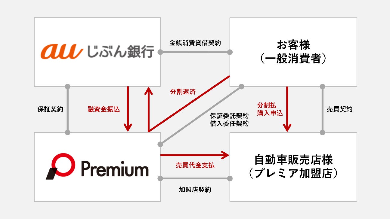 本提携は、プレミアがお客様(一般消費者)に提供するオートクレジット契約に基づき、auじぶん銀行がお客様と金銭消費貸借契約を締結して資金提供を行い、プレミアがその融資を保証するものです。
