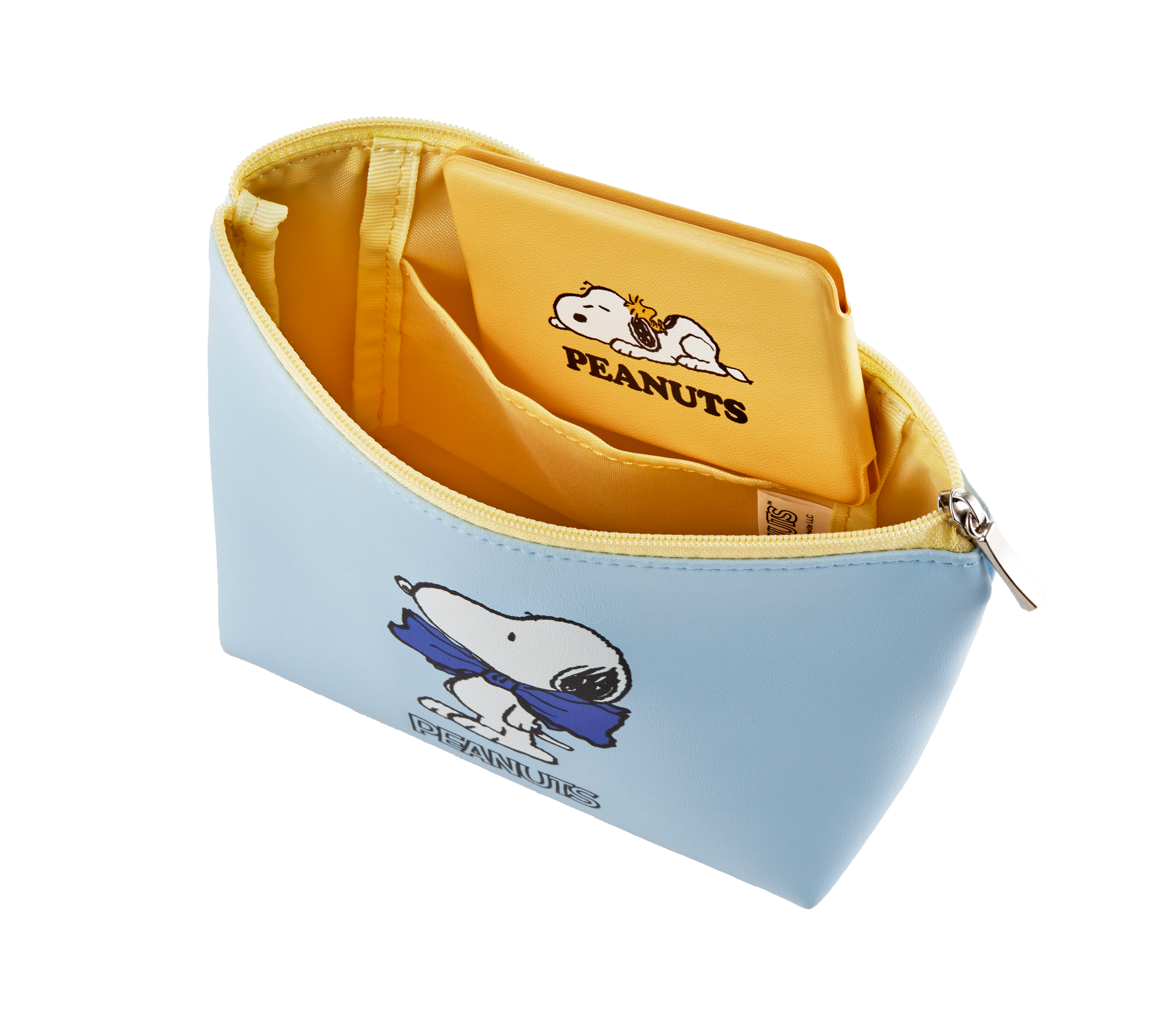 「スヌーピー ポーチ&ミラーセット」のデザインは2種類で、ホイップホワイトカラーのポーチは、ハートを抱えたスヌーピーをあしらい、ブルーカラーのポーチはリボンタイをつけたスヌーピーをデザインしました。またミラーには、それぞれウッドストックとスヌーピーが描かれており、その姿を楽しめます。数量限定の非売品で無くなり次第終了しますので、ぜひこの機会にお早めにお求めください。