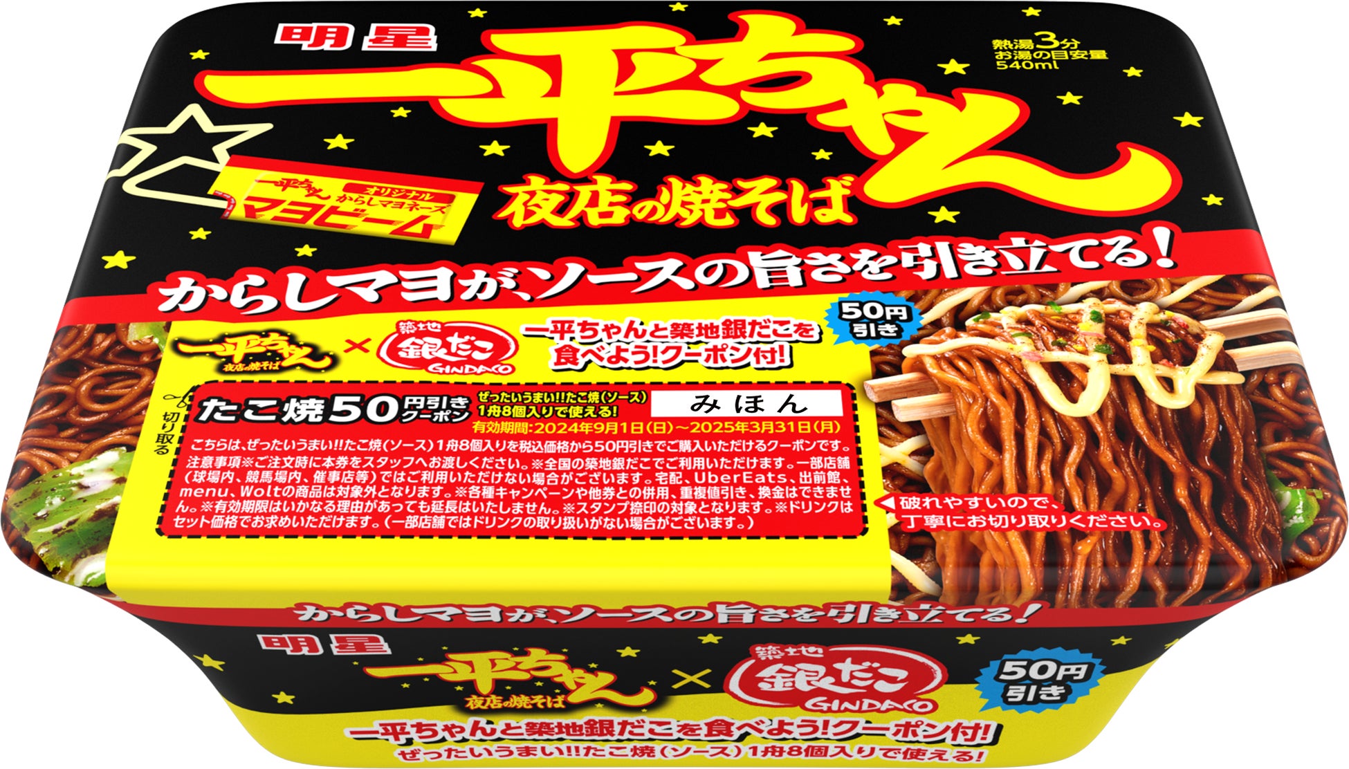 さらに、「明星 一平ちゃん夜店の焼そば」には、「築地銀だこ」のたこ焼50円引きクーポンが付いたパッケージの発売が決定いたしました。
