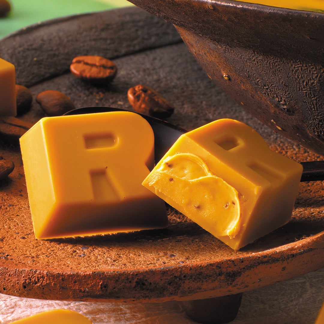北海道産かぼちゃのパウダーをつかったクリームに京都 小川珈琲で焙煎したコーヒーの微粉末をブレンドし、北海道産かぼちゃパウダーをつかったチョコレートに閉じ込めました。