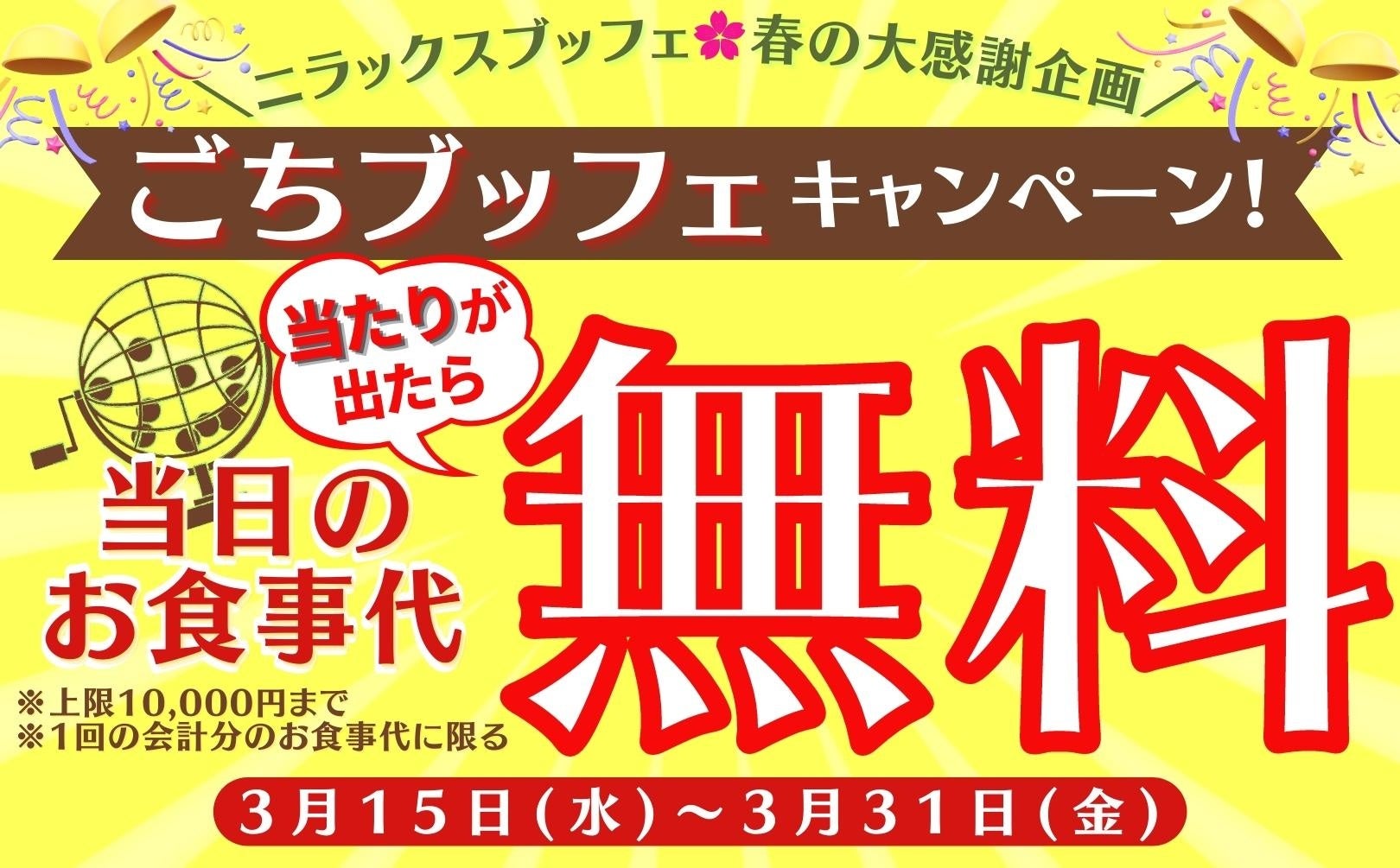 この度、2023年3月15日(水)~ 2023年3月31日(金)の期間限定にて、最大10,000円のお食事代が無料になる?!『ごちブッフェキャンペーン』を開催いたします!