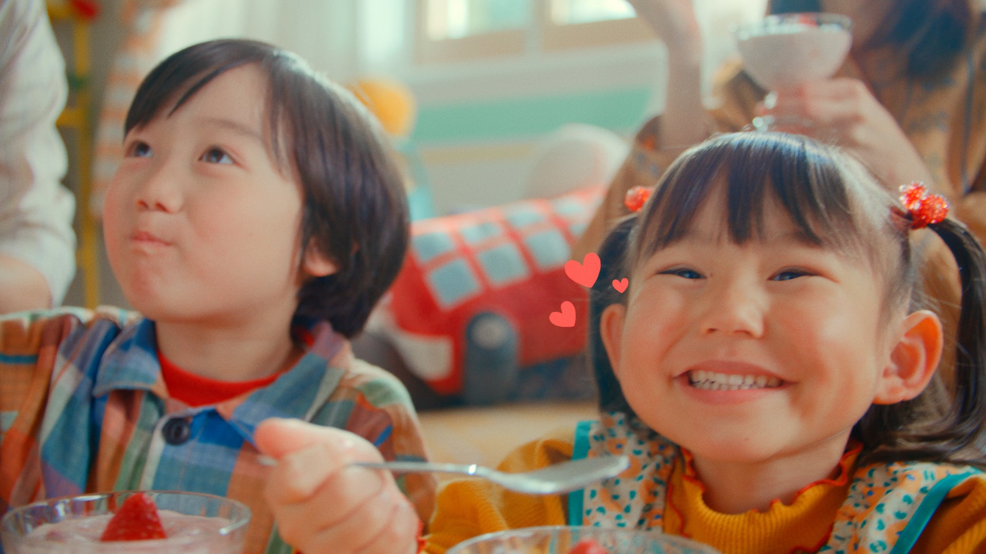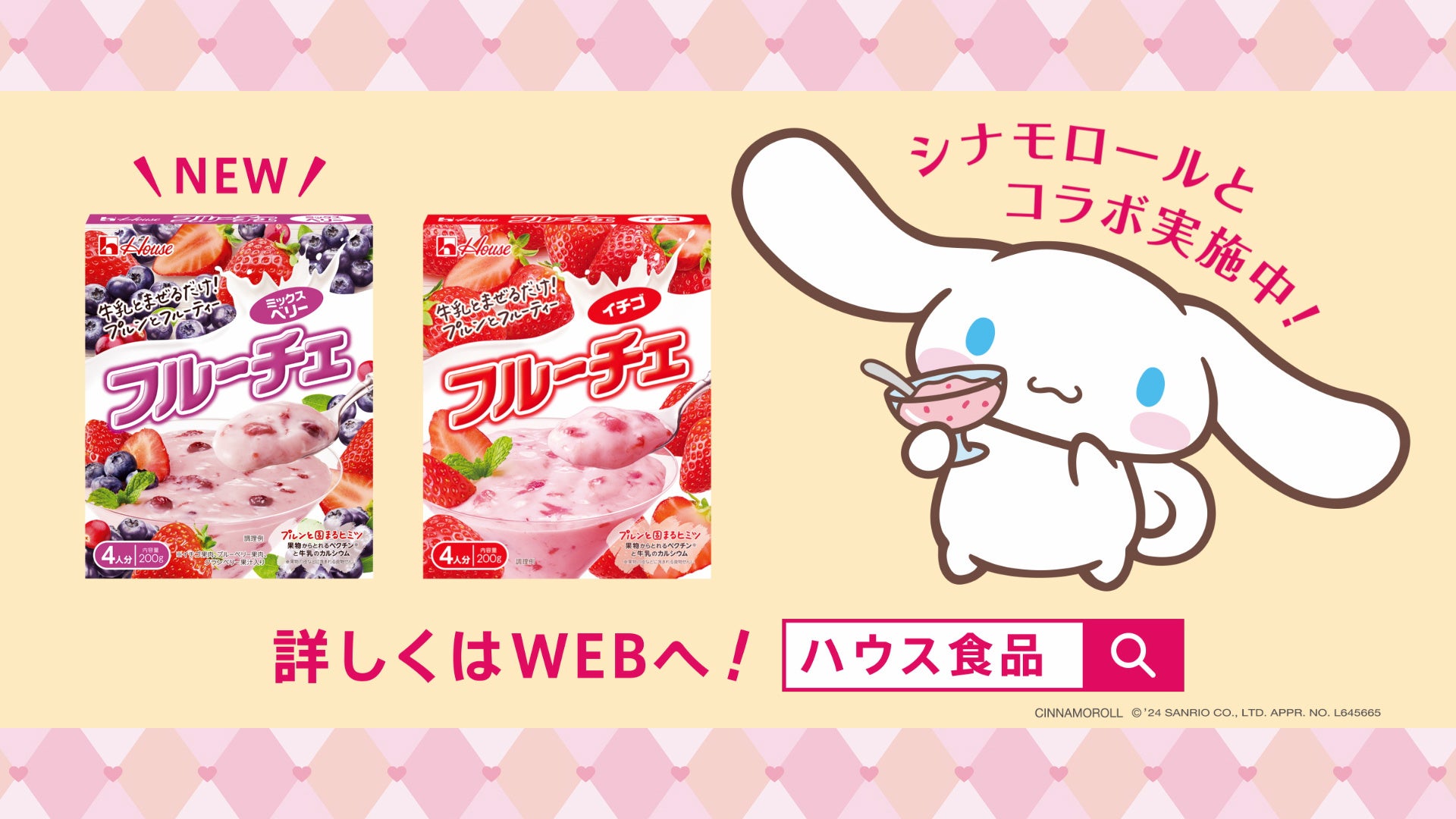 “ちょこっと手作り いっぱいハッピー”をテーマに、フルーチェならではの明るく元気な世界観で、親子の楽しいフルーチェタイムを伝えます。TVCMの最後にはシナモロールも登場します。