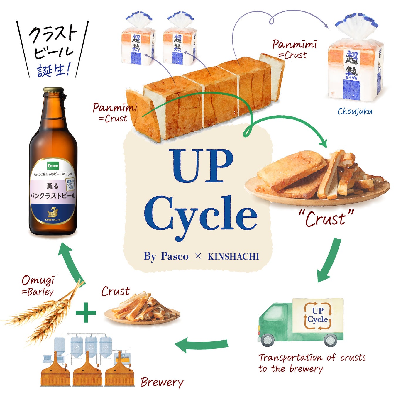 「薫るパンクラストビール」は、「超熟」を製造する過程で出たミミ(1斤ずつにスライスする際にカットする両端部分)をビールの原料であるモルトと一部置き換えてつくったアップサイクル*ビール(分類上は発泡酒)です。