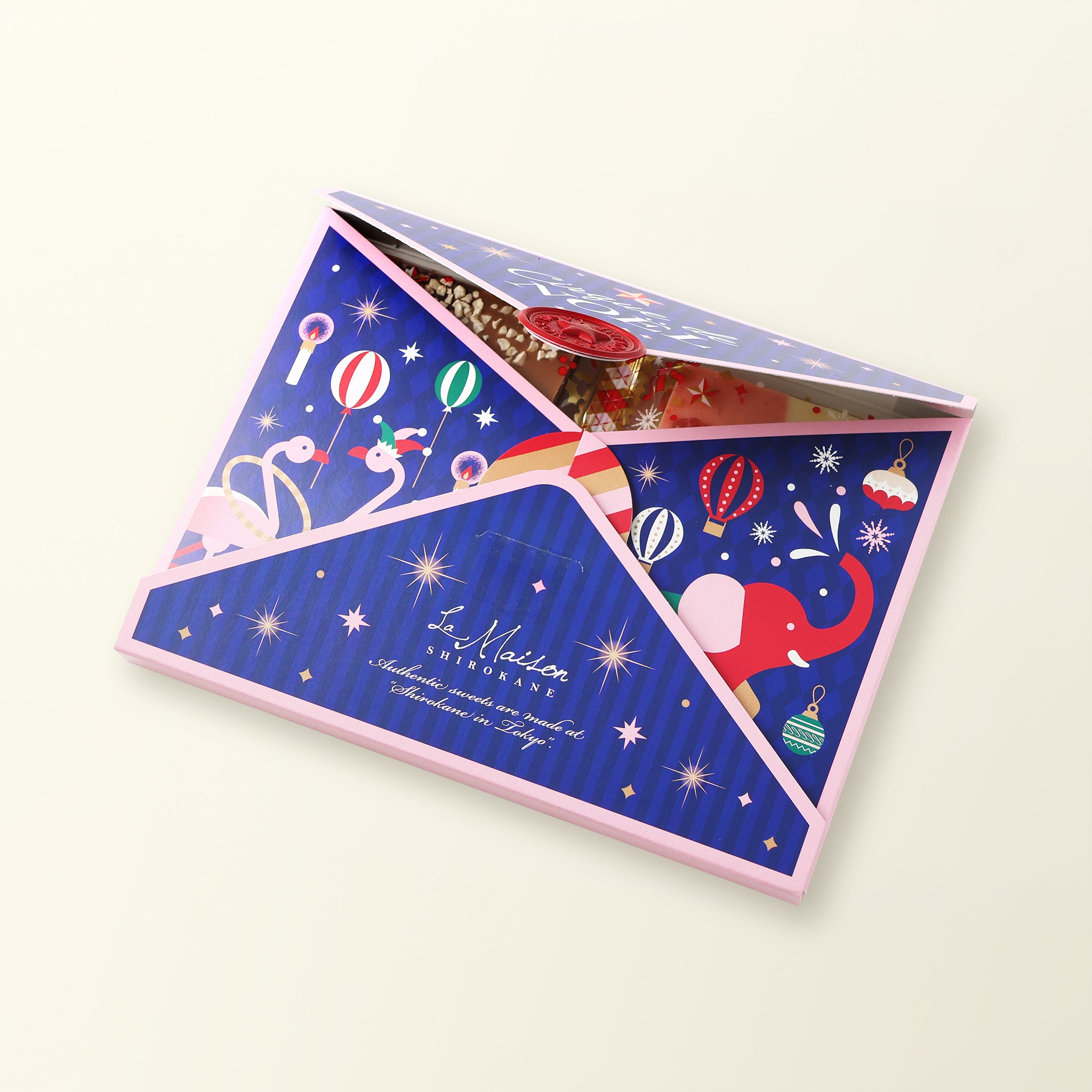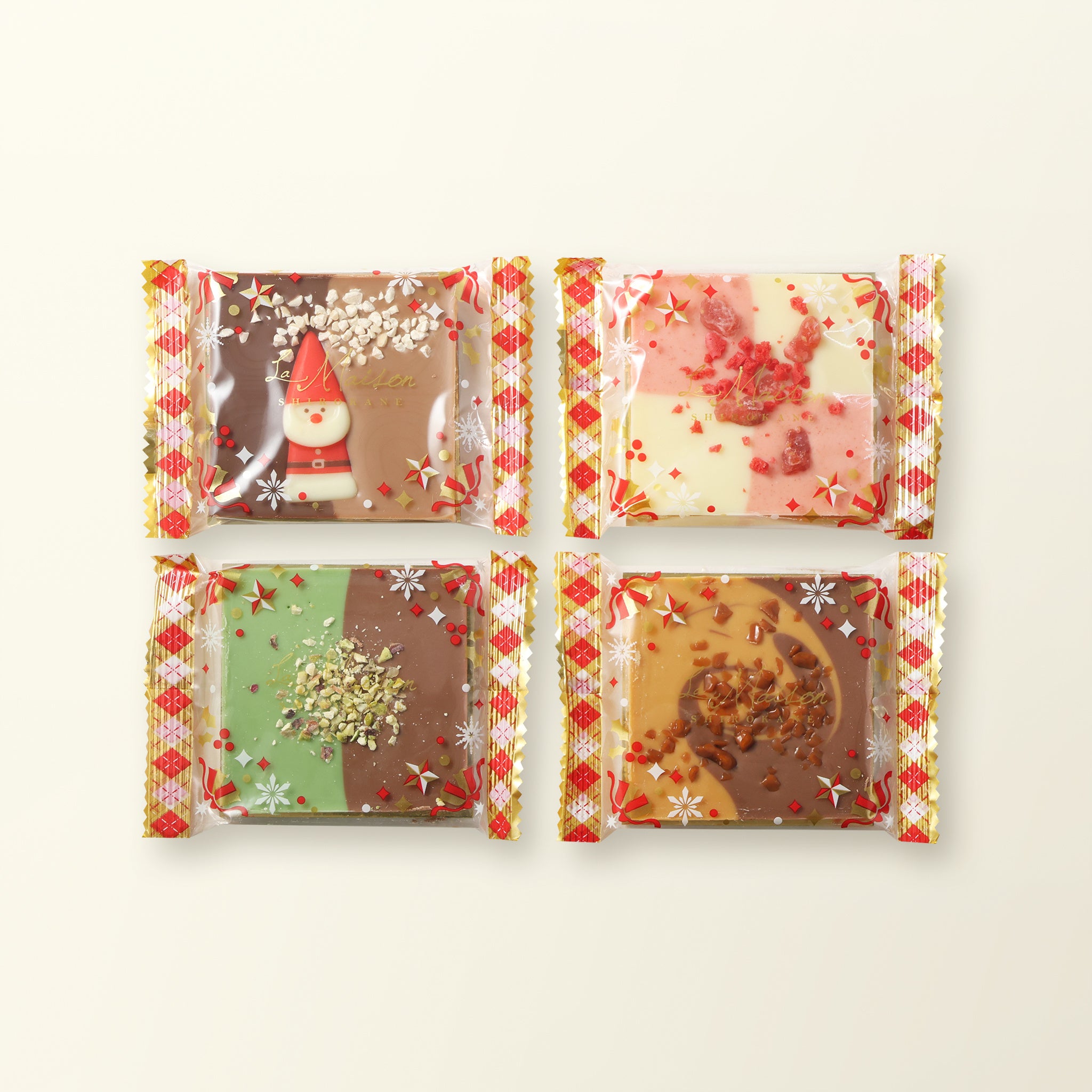 クリスマス限定のデザインフィルムに包まれたタブレットショコラを、心ときめくレター型のパッケージに詰め合わせました。 ラインアップは、サンタをモチーフにした〈アーモンドキャラメル〉をはじめ、〈ホワイトストロベリー〉〈ピスタチオ〉〈ミルクキャラメル〉の4種。 見た目も味わいも個性豊かなショコラが、季節を華やかに彩ります。 大切な方へのメッセージを添えて贈りたくなる、クリスマス気分を一層盛り上げるギフトです。