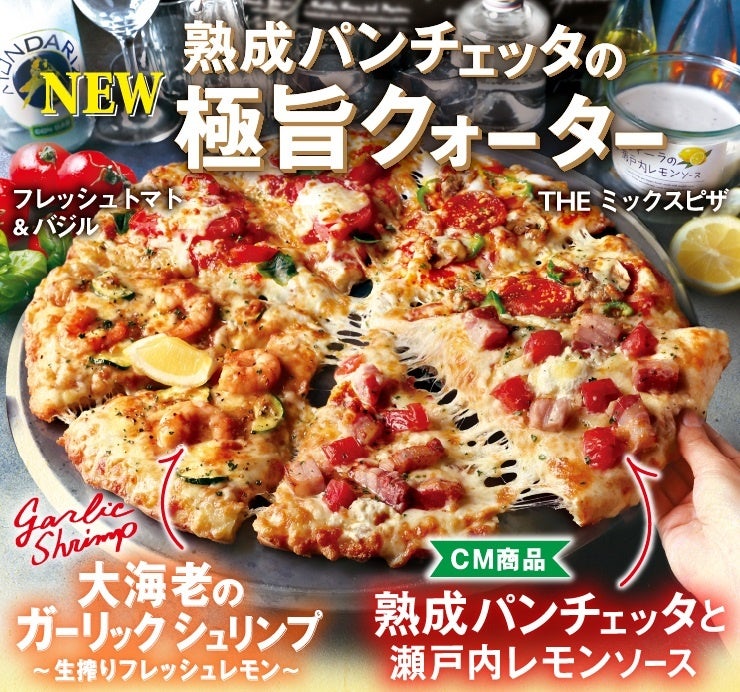 新商品『熟成パンチェッタの極旨クォーター』は、夏の新作「熟成パンチェッタと瀬戸内レモンソース」、スタッフいちおしの「大海老のガーリックシュリンプ」、定番の「フレッシュトマト&バジル」「THEミックスピザ」の4種類を、1枚でお楽しみいただけるクォーターピザです。
